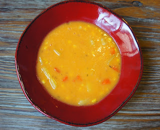 In a stockpot, steamfry (Do not use oil! Add a bit of water or veggie broth if the pan gets dry) onions for 5 minutes. Add carrots and bell peppers to the onions and cook for about 7 minutes, until onions are translucent. Add thyme, black pepper, salt, and cayenne. Steamfry for one more minute. Add veggie broth, corn, potatoes, and bay leaf. Cover and bring to a boil. Then, lower the heat and simmer for 30 minutes, until potatoes are tender. Blend half of the soup in a high-speed blender until very smooth. This will be the base of the soup. Add the blended soup to remaining soup in the pot. Stir well. Serve!